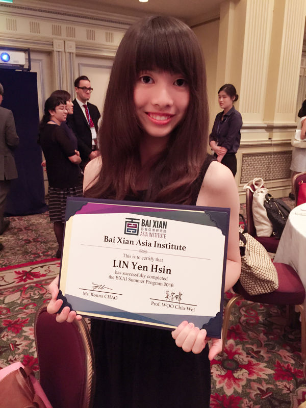 其中, 令她印象深刻的是在2016年參加的「百賢亞洲研究院計畫」,其他學員是來自日本京都大學、慶應大學、北京大學燕京學堂的學生,計畫主題環繞亞洲區域衝突進行討論。