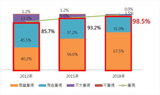 受訪企業人資對於企業重視發展國際化人才團隊的比例,自2012年的85.7%、2015年的93.2%、到2018年的98.5%,持續平穩提升,顯示發展國際化人才團隊一直是大型企業重視的項目。