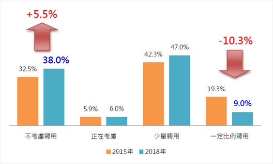 a. 在2015年詢問企業聘用外籍人才之狀況,19.3%的企業已雇用相當數量及比例(超過10%)之外籍人才;但在2018年的調查,僅有9.0%的企業人資表示公司有聘用一定比例的外籍人才,減少10.3%。反觀2018年受訪人資回答不考慮聘用外籍人才的企業有38.0%,較2015年的32.5%增加5.5%。