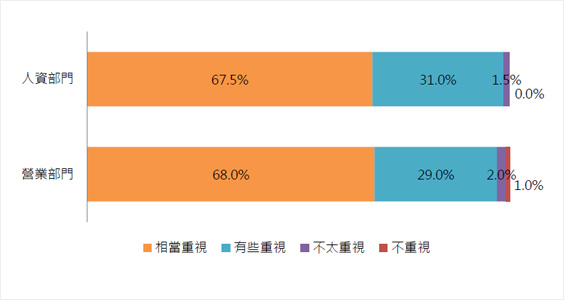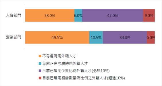 b. 在此次調查中,將調查對象分成「人資主管」及「營業部門主管」。人資部門及營業部門都認為公司相當重視發展國際化人才團隊,皆超過97%。但在聘用外籍人士方面,有近五成(49.5%)營業部門不考慮聘用外籍人才。