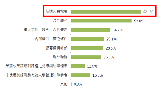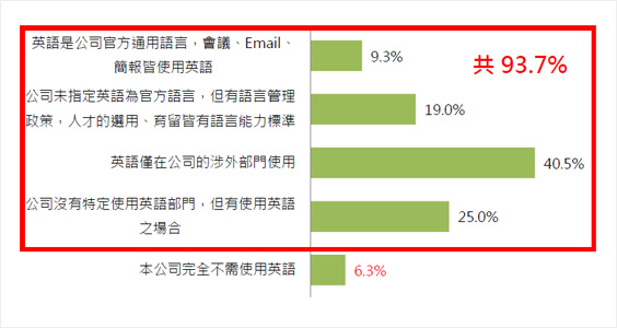 9.3%的受訪企業表示「英語是公司官方通用語言,會議、Email、簡報皆使用英語」;19.0%的受訪企業有語言管理政策,人才的選用、育留皆有語言能力標準:40.5%的受訪企業表示「英語僅在公司的涉外部門使用」;「公司沒有特定使用英語部門,但有使用英語之場合」占25.0%;僅有6.3%的受訪企業表示「公司完全不需使用英語」。