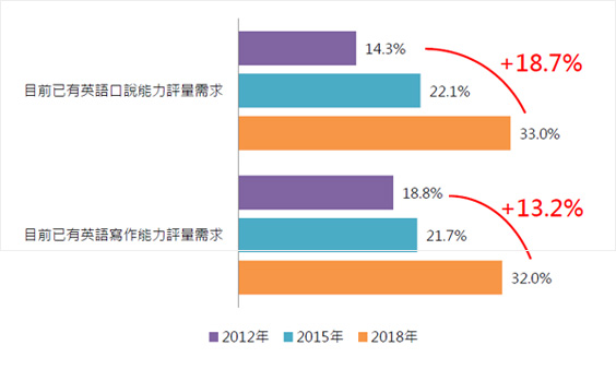 b. 受訪企業人資對英語口說與寫作能力評量需求逐年提升,與2012 年相比,2018年企業對英語口說能力評量需求上升18.7%;對英語寫作能力評量需求上升13.2%。
