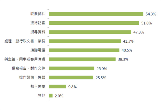 在此次調查中,有超過半數(52.5%)受訪企業表示會對基層員工要求基礎的英文能力。基層員工可能使用英語之工作內容,以「收發郵件」最多(54.3%),其次為「接待訪客」(51.8%)、「搜尋資料」(47.3%)、「處理一般行政文書、業務」(41.3%)、「接聽電話」(40.5%)、「與主管、同事或客戶溝通」(38.3%)、「撰寫報告、製作文件」(26.0%)、「操作設備、機器」(25.5%),僅有9.8%的企業表示基層員工「都不需要」在工作上使用英文。