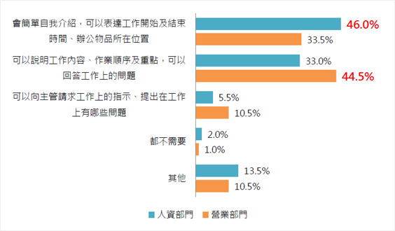 分析發現,「營業部門主管」相當重視基層員工的基礎英語能力,有62.0%要求基層員工具備基礎英語能力,且最希望基層員工「可以說明工作內容、作業順序及重點,可以回答工作上的問題」(44.5%);人資主管則最希望基層員工「會簡單自我介紹,可以表達工作開始及結束時間、辦公物品所在位置」(46.0%)。