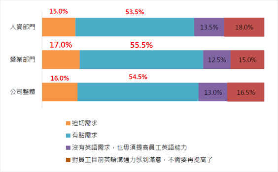 從人資部門及營業部門兩者來看,會發現招聘單位與實際用人單位之間的需求出現落差,在人資單位認知公司對提高員工英語能力的需求為68.5%,而在實際用人單位對於卻有72.5%。