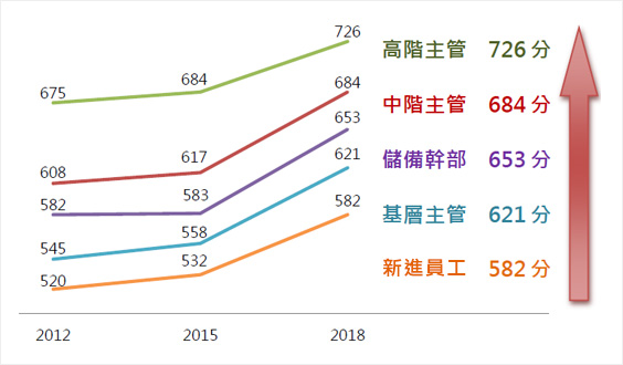 2018 年企業員工職位英語能力標準,企業要求新進員工多益成績平均是582 分,要晉升基層主管是621 分,儲備幹部則是653 分。中級主管多益成績平均為684 分,高階主管則達726 分。不僅職級愈高,對英語能力的要求愈高,標準也較三年前提高不少,顯見企業對於員工的英語能力要求也愈來愈高。
