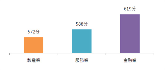 再從產業別分析,製造業招募新進員工的多益測驗成績平均為572 分、服務業588 分、金融業為619 分;而2017 年台灣一般大學/技職校院生的多益測驗平均只有514 分,大學生英語能力與企業需求有明顯落差。