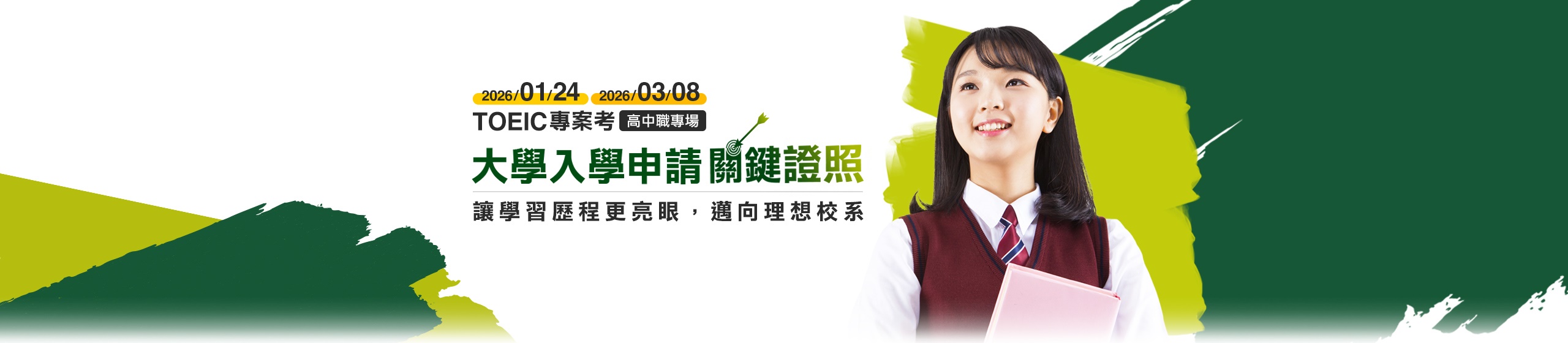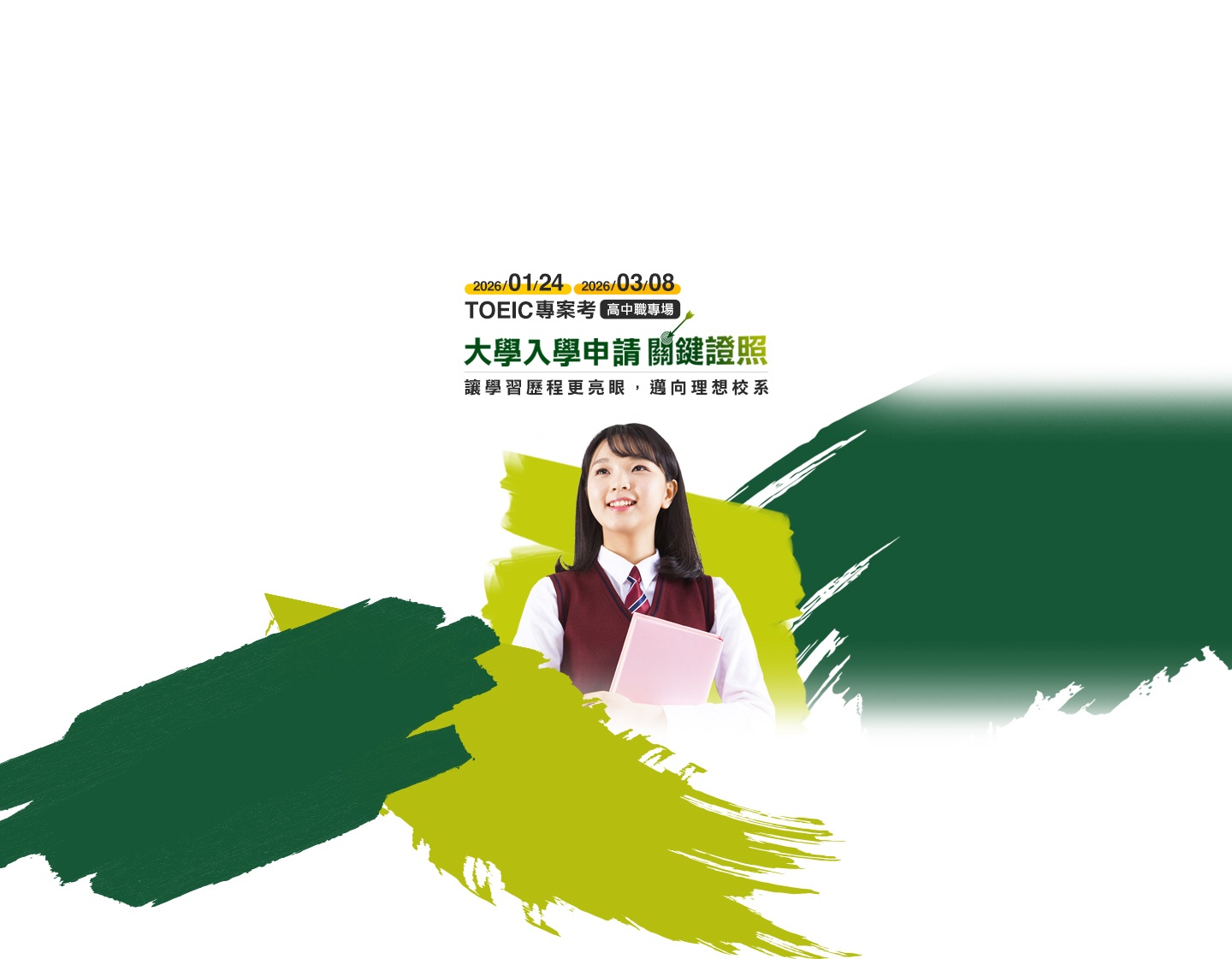 專案考 高中職專場】,讓高中職生及時取得TOEIC測驗成績,迎戰大學入學申請,前進心中理想校系!