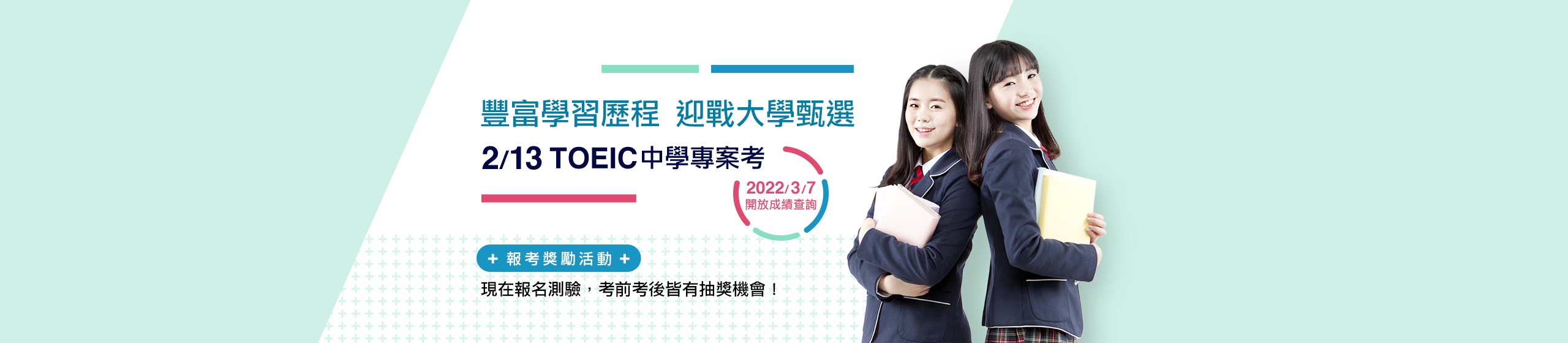 1.【2/13 TOEIC中學專案考】報名期間:2021/11/15~2022/1/4。