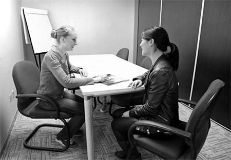 Statement (C), “They’re sitting at a table,” is the best description of the picture, so you should select answer (C) and mark it on your answer sheet.