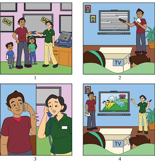 Directions: The four pictures below illustrate a story. In your own words, tell the story. Your story should explain what happens in the pictures and why. You can describe places, people, actions, and feelings. You have 45 seconds to prepare and 60 seconds to speak.