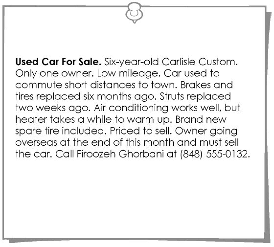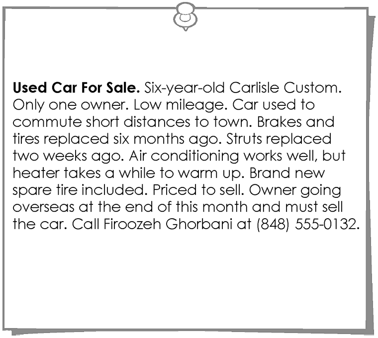 148. According to the advertisement, why is Ms. Ghorbani selling her car?