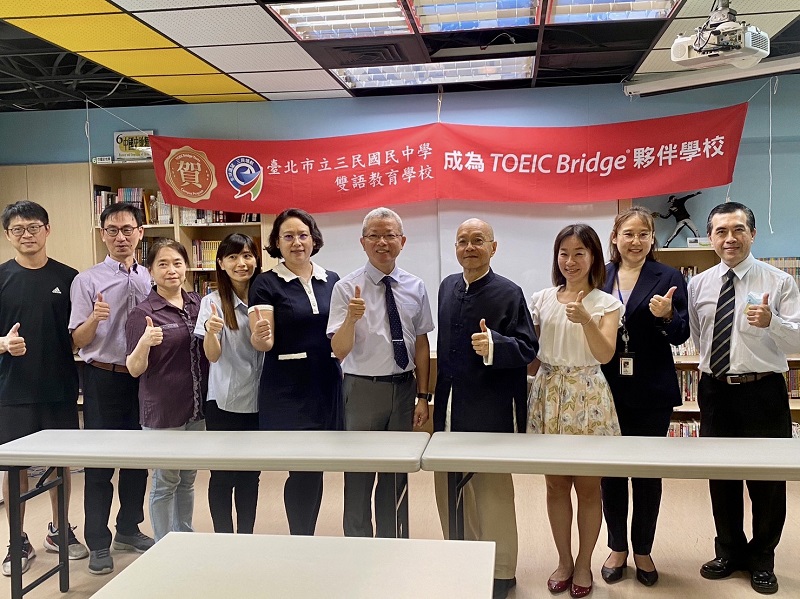 臺北市立三民國中與TOEIC Bridge測驗台灣區總代理忠欣公司於今日舉行TOEIC Bridge School簽約儀式,未來兩所機構將攜手合作強化英語品質教育,為三民國中的師生提供更豐富的英語教學資源,讓學生逐漸發展出更多與世界溝通、連結的自信。